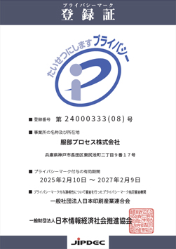 ※服部プロセス株式会社では、プライバシーマーク付与認定を取得しています。